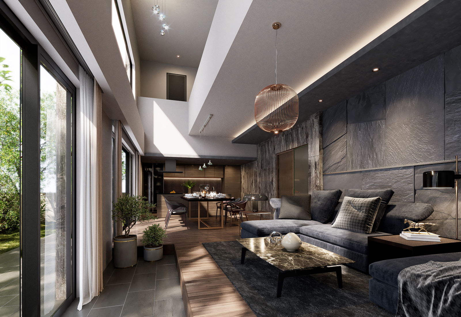 吹き抜けリビング、自然光の入り方、マテリアルの質感やライティングまで細かく設計し、実在感のある空間表現を目指しています。