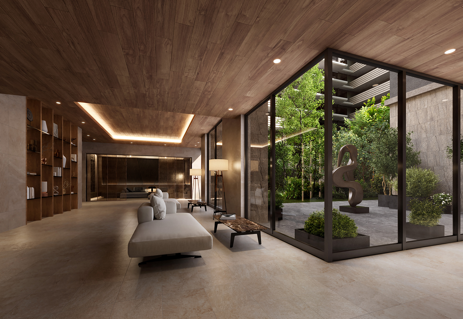 大開口のサッシから見える中庭の植栽が、室内のモダンなインテリアと溶け合うようなフォトリアルなレンダリングを行っています。