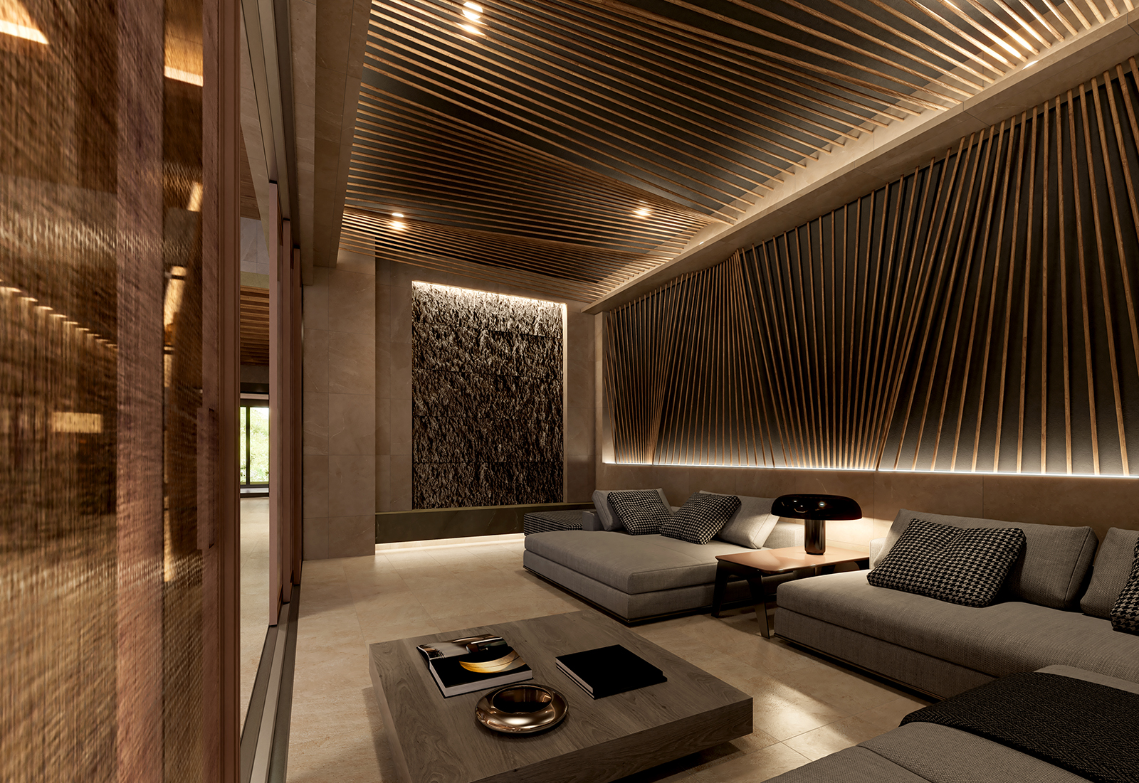 天井から壁面へと連続する木格子のライン。その隙間に忍ばせた間接照明が、空間にリズムと奥行きを与えています。光が格子の角をなぞる繊細な階調を表現するため、レンダリング設定を細部まで調整しました。